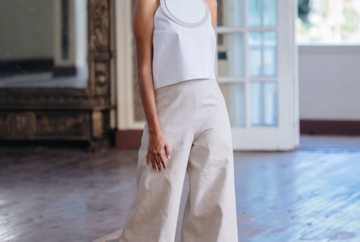 El sobretodo asimétrico, adornado con un delicado detalle de flor, aporta un toque artístico y único. El corsé strapless complementa perfectamente el look, realzando la silueta con su diseño limpio.